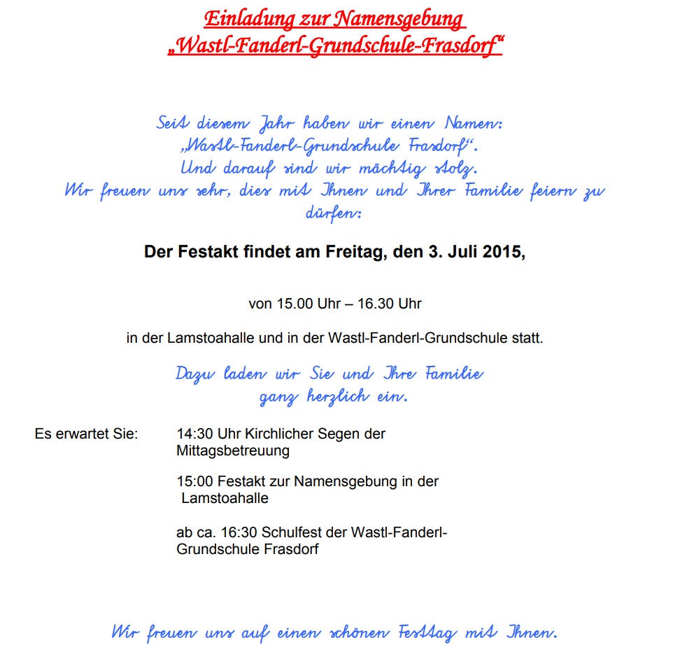 Im Jahre 2015 erfolgte die Umbenennung der Grundschule Frasdorf in „Wastl-Fanderl-Grundschule“