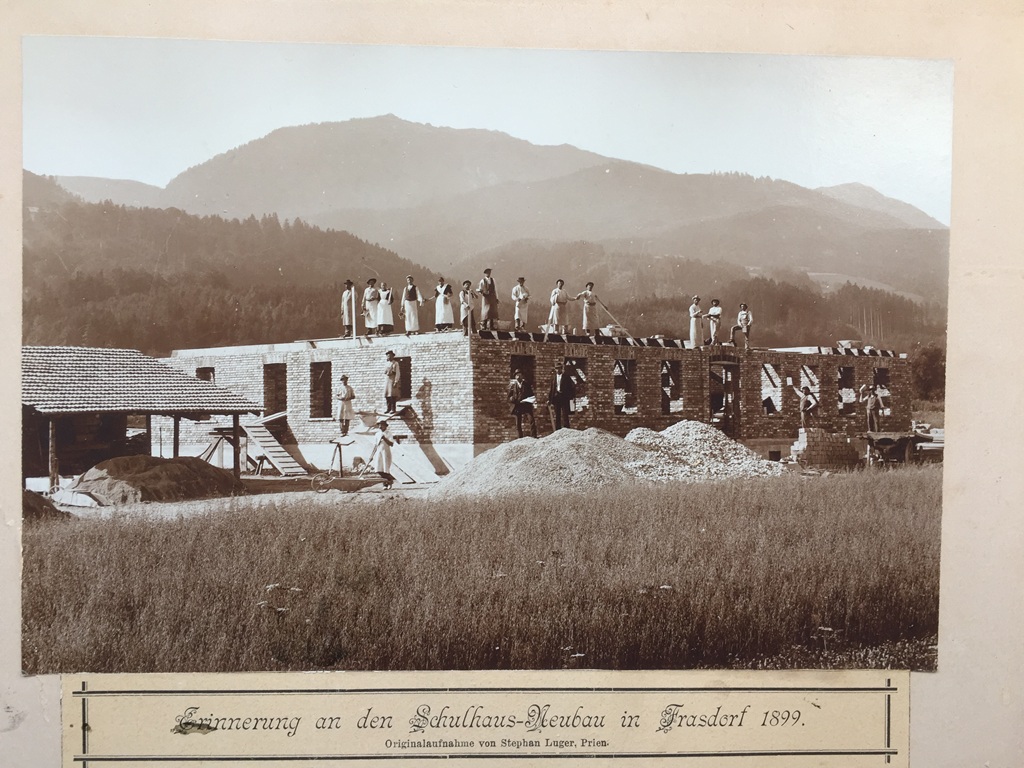 Anscheinend war der Umbau des alten Schulhauses im ehemaligen Gerichtsdienerhaus im Jahre 1874 doch nicht so gut gelungen. Denn schon 25 Jahre später begann man, neu zu planen. Der damalige Lehrer Alois Mutzl war die treibende Kraft. Zunächst überlegte man, das bisherige Schulgebäude abzureißen und dort neu zu bauen. Aber dies hätte erhebliche Kosten verursacht, zumal die Nachbarn keinen Grund hergeben wollten. Auch die Wasserreserve hinter dem Schulhaus war ein Problem. Es wurde dann ein großer freier Platz zwischen den Ortsteilen Frasdorf und Westerndorf gewählt, der nicht weit von der Kirche entfernt war. Es handelte sich um das Grundstück Pl.Nr. 196 des Georg Dettl (Ebner), Größe 0,313 ha. Kaufpreis 2200 Mark.